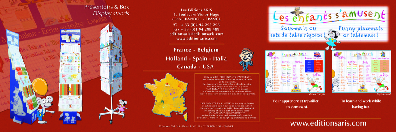 “LES ENFANTS S’AMUSENT” est l’unique collection éducative de sets de table et de sous-mains. Destinée avant tout aux enfants afin de les aider dans leur programme scolaire. La gamme “LES ENFANTS S’AMUSENT” est exclusive et s’enrichit en permanence de nouveaux thèmes pour le plus grand bonheur des enfants et des parents.